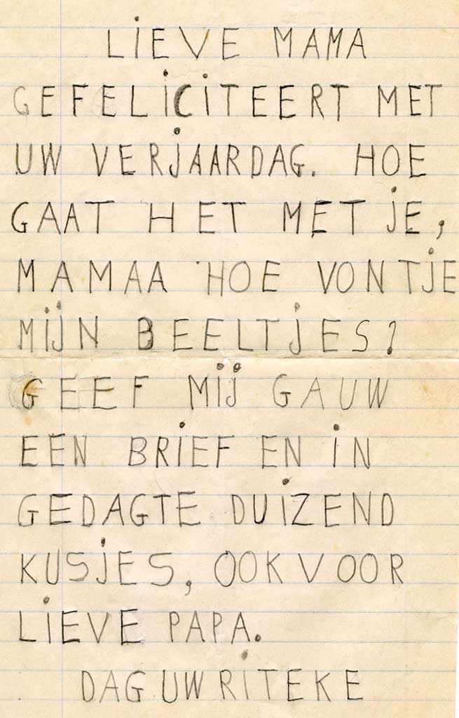 Rita bleef hier tot het einde van de oorlog. Ze was toen zo gehecht aan haar onderduikouders en broertje dat ze eigenlijk niet meer weg wilde. Na de bevrijding kwamen haar ouders haar ophalen. Ze konden niet terug naar hun huis in de Jekerstraat en kregen inwoning bij de familie Amsterdam in Betondorp. De vader van het gezin Bertus Amsterdam had veel verzetswerk gedaan. Hij was regelmatig vanuit Amsterdam naar Zeist gefietst om geld te brengen naar het adres waar de ouders van Rita zaten ondergedoken. Hij had ook Rita’s onderduik adres geregeld.